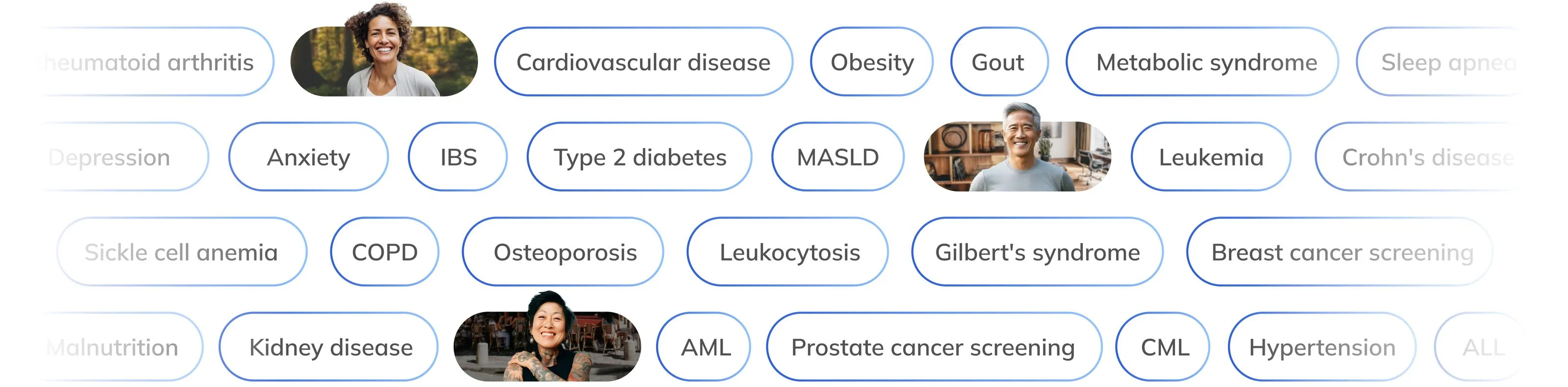 Our clinical team carefully selected these tests to provide a full view of your health. All tests listed are included in the Plus plan ( tests), while those marked with a blue dot (•) are in the Essential plan (40+ tests). Tests labeled "Add-on" can be purchased separately.